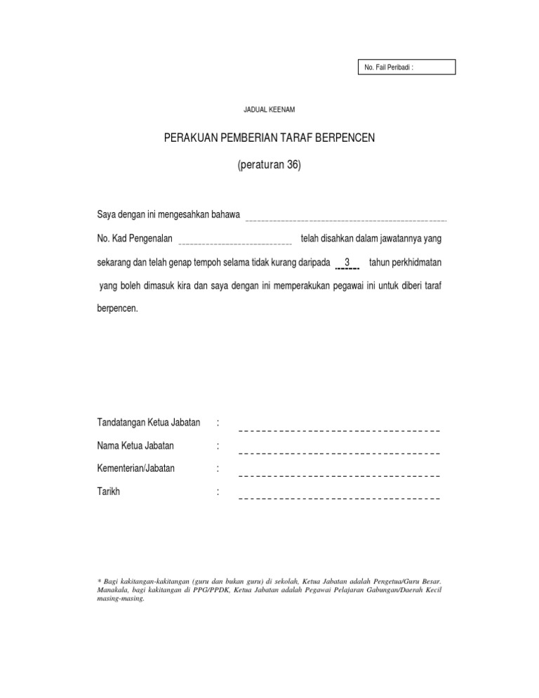 Perakuan pemberian taraf berpencen jadual keenam p u. Kad pengenalan anda contoh. Jadual keenam perakuan pemberian taraf berpencen peraturan 38 saya dengan ini mengesahkan bahawa.