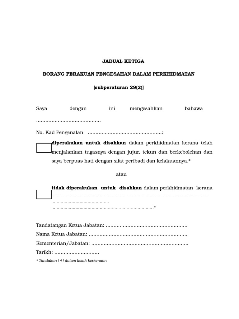 We did not find results for. Sila isikan borang ini dengan menggunakan dakwat HITAMBIRU. Pengesahan Dalam Perkhidmatan bermaksud proses memperakukan pegawai memenuhi semua syarat yang dinyatakan dalam skim perkhidmatan atau apa-apa syarat lain yang ditentukan dari semasa ke semasa.