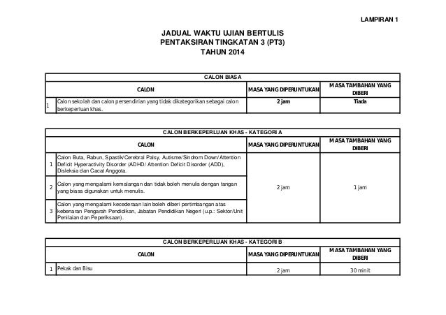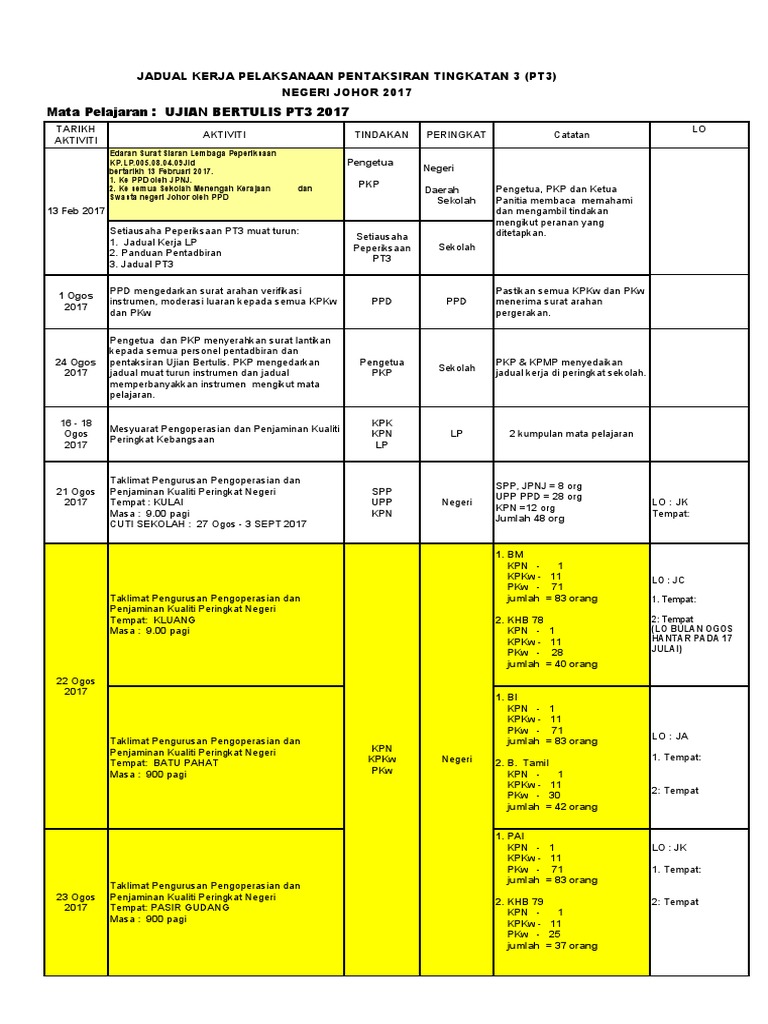 Penggunaan buku kerja di sekolah. JADUAL KERJA UJIAN BERTULIS PT3 BIL PERKARA TARIKH TINDAKAN 1 Pe Taklimat Pengoperasian dan Penjaminan Kualiti PT3 Ujian Bertulis Peringkat Negeri dan Daerah 21 hingga 31 Julai JPN PPD ngetua GKMP Pementoran KPN 2 Taklimat Pengoperasian dan Penjaminan Kualiti PT3 Ujian Bertulis Peringkat Sekolah. Jadual waktu pt3 2018 cbk A.