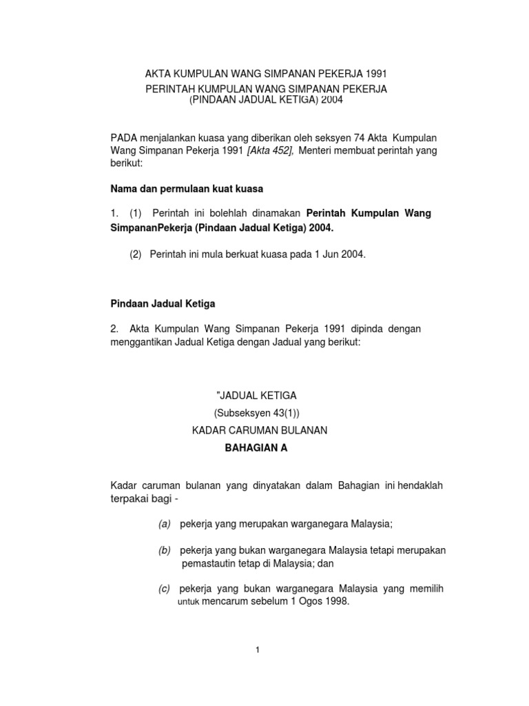 AKTA KUMPULAN WANG SIMPANAN PEKERJA 1991 JADUAL KETIGA Seksyen 43 dan 44A KADAR CARUMAN BULANAN BAHAGIAN. Rujukan adalah seperti berikut. Caruman kwsp diturunkan kepada tujuh peratus.